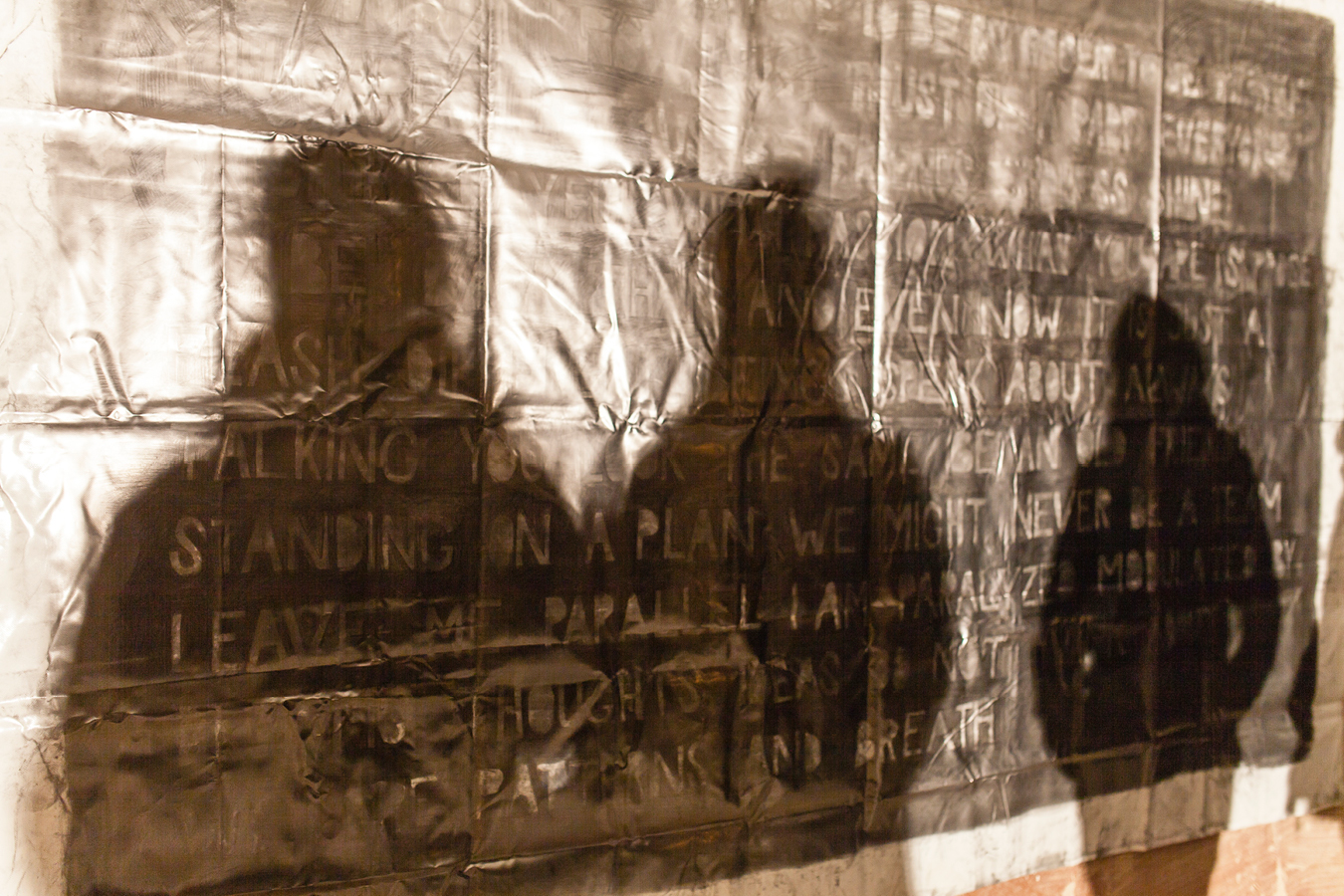 Mari Lena Rapprich inszenierte die Lesbarkeit eines Textes, der in einer Grafitzeichnung eingelagert ist. Das Zusammenspiel von Licht-, Schatten- und Reflexionsverhalten veränderte das Erscheinungsbild der Zeichnung in Abhängigkeit von Standort und Verhalten der Betrachter:innen im Raum.