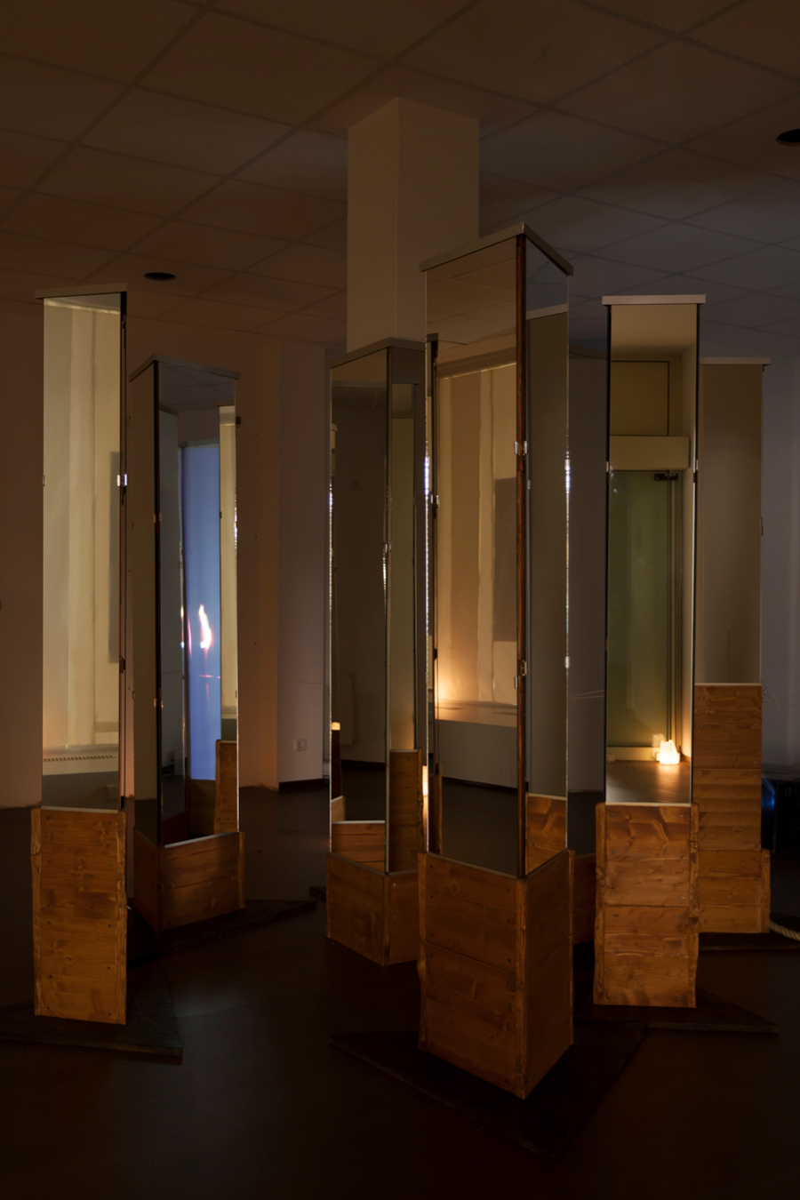 One element of project 815 is the open mirror cabinet by Paul Ole Matyschok. The image of a flame flickered on an arrangement of mirror columns in this public space; the origin of the flame cannot be traced. Licht 815 was a compilation of projects that addressed the light from 815 – fire.