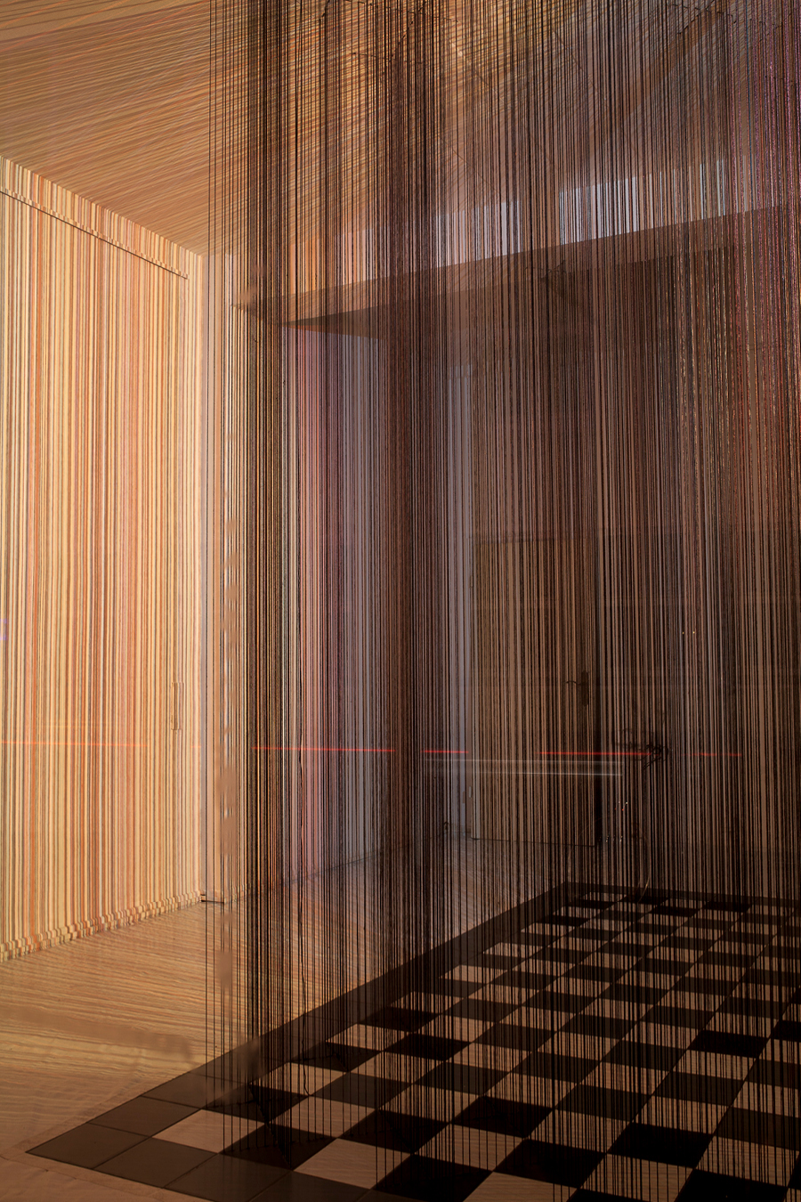 Zwischen Architektur und Skulptur entwickelten Marion Cziba und Maria Elena Schmidt ein Raumgebilde aus unzähligen Millimeter dünnen Fäden, das sie in die Kubatur des Raumes einspannten. Im Wechselspiel von Lichteinfall und Blickrichtung der Betrachter:innen entstanden abstrakte Formenmuster und geometrische Schattenfiguren.